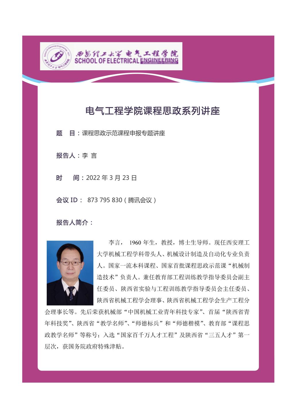 为全面落实立德树人根本任务,有效推进永利23411集团课程思政建设工作深入开展。3月23日,学院邀请国家级课程思政教学名师、陕西省教学名师李言教授为我院教师开展了课程思政专题讲座,讲座在腾讯会议进行。电气学院45岁以下全体教师、辅导员等78人听取了报告,贾嵘教授主持。