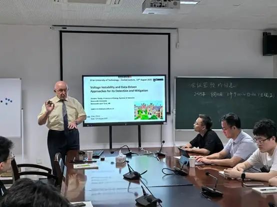 本次学术报告于8月12日上午10:00至12:00顺利举行。Terzija教授以低碳电力网络电压稳定为核心,系统阐述了该领域的研究背景、挑战与前沿技术。报告指出,电压稳定长期以来是电力系统研究的核心议题。传统上,研究多集中于机理明确的“长期电压稳定”。然而,故障导致的电压恢复过程,具有较强的动态性,常导致短期电压失稳,尤其在感应电动机失速场景下。随着电力电子变流器大量接入,现代电网呈现出“弱化”趋势,对短期电压失稳更为敏感。现有基于模型的动态仿真方法虽有效,但难以满足实时应用需求。针对此挑战,Terzija教授重点介绍了新兴的数据驱动方法。该方法依托智能传感与通信技术,为短期电压失稳的实时检测与监测提供了极具前景的解决方案。报告深入探讨了多种电压失稳现象,并提出了一种最大李雅普诺夫指数(Maximum Lyapunov Exponent)算法,用于短期电压失稳的实时检测与监测,展示了数据驱动技术在电力系统动态安全评估中的巨大潜力。