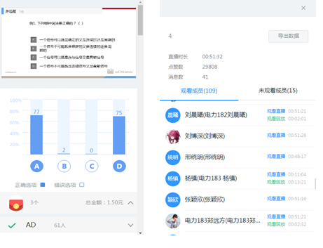 因此,课程设计考虑课程全过程:对于设备与网络良好的70%同学,课前提前推送课堂讲义PPT;对流量受限的2%同学钉钉下载直播回放视频;所有同学可以在钉钉群与微信群随时交流互动;雨课堂推送题目与作业;再加上学院给同学流量支持,目前在线课程参与率达到了100%,所有同学都能参与到课程当中。