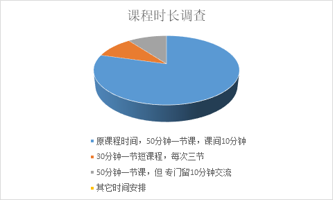 此外,第一周测试了不同时间长度的课程时长设计组合方式,第二周超过80%同学反馈仍然最习惯常规课程时间设置,效率最高。具体如下图: